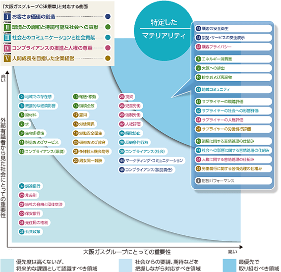 マテリアリティマップとは横軸に経営への影響度、縦軸にステークホルダーの関心度・影響度を取り、各課題をプロットしたものです。原点に近い、つまり経営への影響度が低く、ステークホルダーの関心度・影響度も低い課題に関しては重要ではなく、原点から遠ざかるに従って重要度は高まります。その際、経営への影響度が小さくてもステークホルダーの関心が高い項目や、逆にステークホルダーの関心が低くても経営への影響度が高い項目については状況を見極めつつ対応すべき重要性の高い課題となります。往々にして軸を1つで考えていると、もう一方の軸で見た場合の重要課題を見落とす可能性がある事から、線ではなく面で理解する事が重要となるわけです。